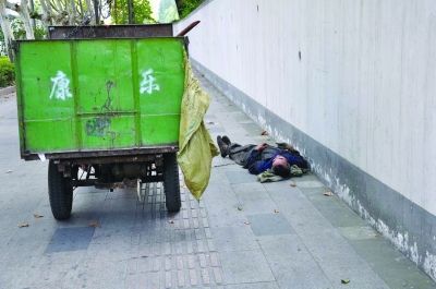 偌大的平板垃圾车,地上一片片枯黄的树叶,车旁垂挂着一条黄色垃圾袋,推车的环卫工人可能累了,和衣躺在路边墙脚处静静地睡着了,头下的“枕头”是经过折叠的破口袋。14日,网友“逝安适”路过扬州市大学南路时看到这样一幕,随手拍下后发到了网上。“心酸”、“感动”、“敬佩”……看到照片的网友,纷纷跟帖表达自己的感受。