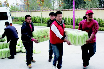 3日上午8点钟,3000余斤大白菜和300余斤冬瓜已经装好了车,来自临沂市公交总公司各科室的20余名团员也整装待发。经过半个小时的车程,公交总公司一行很快来到临沂市儿童福利院。协调好放置场地后,大家齐动手,将白菜和冬瓜从车上卸了下来,然后三两人自由组成一组轮流将白菜搬到仓库。
