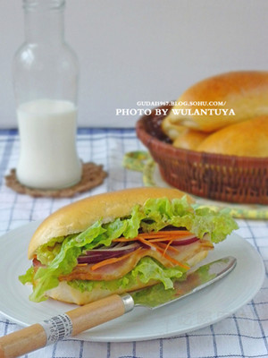 材料:杂粮土司三片,鸡蛋一个,火腿4小片,早餐奶酪一片