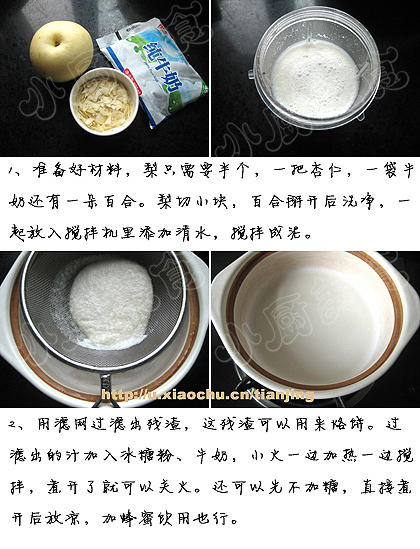 这次的饮品,因为用到了四种白色的润肺的食材:杏仁、百合、梨、牛奶,所以,我就给起了个很直白的名字:“四白露”。其实,这是由传统的润肺美颜佳饮“杏仁露”演变而来的。传统的“杏仁露”里食材只有杏仁,咱给革新了下,再添加了梨、百合,材料增加了,营养也更丰富了些。这几样材料都是润肺效果很好的,经常吃不仅润肺,对皮肤和毛发都有好处。