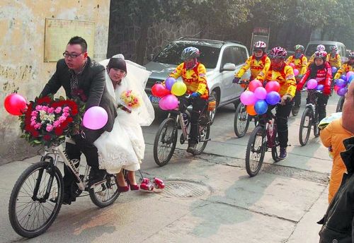 河南男子骑自行车迎娶新娘 百位骑友护航