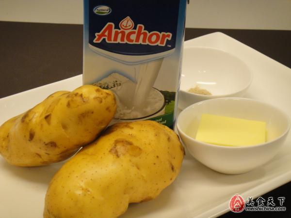 材料:荷兰土豆2个,牛奶或者淡奶油200ml,我比较喜欢放淡奶油(放的量可以根据可根据个人喜好加减),推荐用安佳的黄油80克,奶味更加浓郁。盐,白胡椒少许。