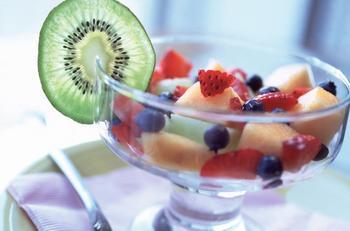 3.把1/2汤匙盐、柠檬汁、榄油、生鱼片、黄瓜、樱桃、西红柿、放在鸡尾酒碗里,搅拌。