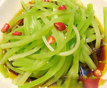 5、凉拌莴笋 莴笋味道清新且略带苦味,可刺激消化液分泌,增进食欲。莴笋中有很多无机盐、维生素成分,含钾量也较高,对控制高血压有益,同时它对人的基础代谢甚至情绪调节也都有影响。天热时来一盘清爽的醋拌莴笋,有助于缓解压力,增强食欲。