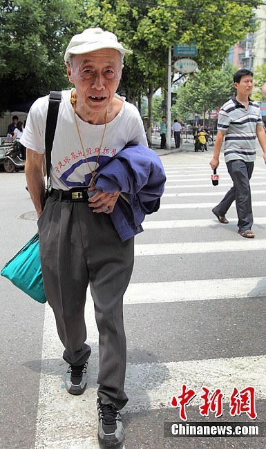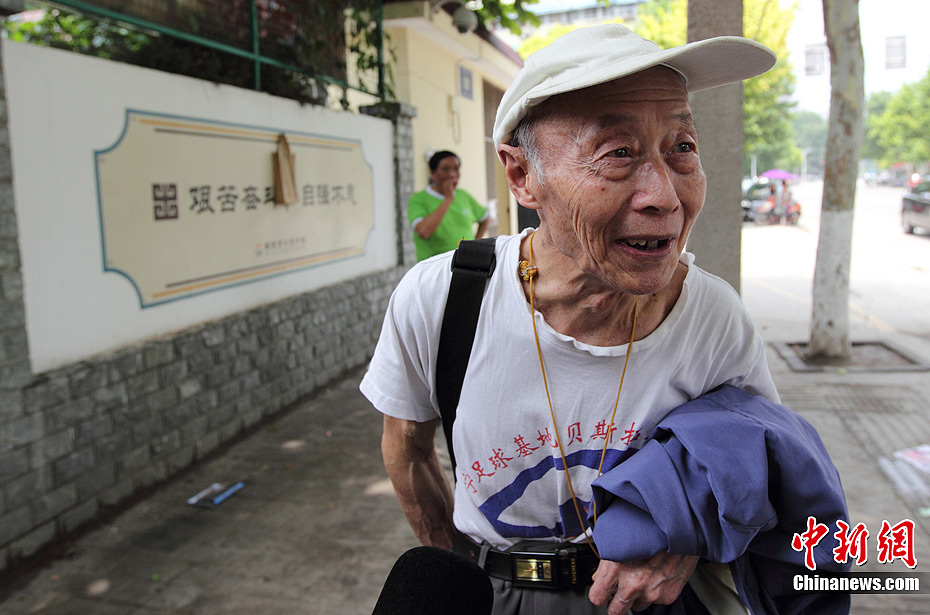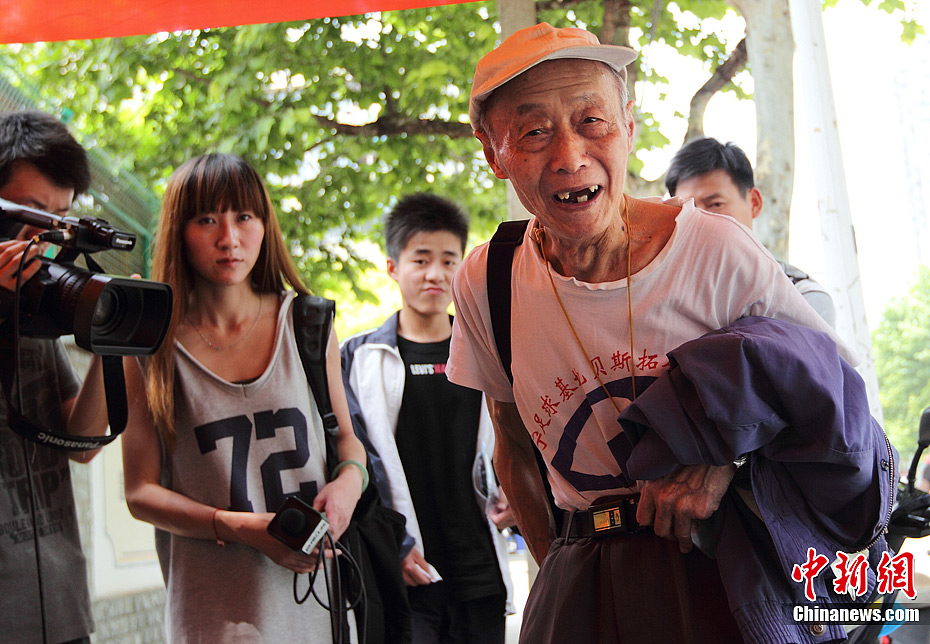 6月7日,2012普通高校招生全国统一考试开考第一天,83岁的汪侠走进江苏南京的一处考点,继续他第12次高考。自2001年高考打破年龄限制以来,当年72岁的南京市民汪侠为圆他的大学梦连年参加高考,每次都铩羽而归。面对今年的高考,汪老显的很乐观,活到老,考到老。汪侠老人很是乐观。泱波 摄