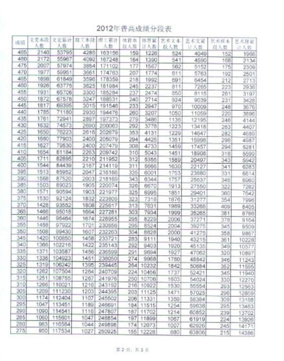 2012年高考成绩分段表2