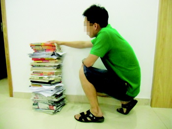 李石(化名)这几年复习用的书籍和打印的考试资料,摞起来有1米多高。