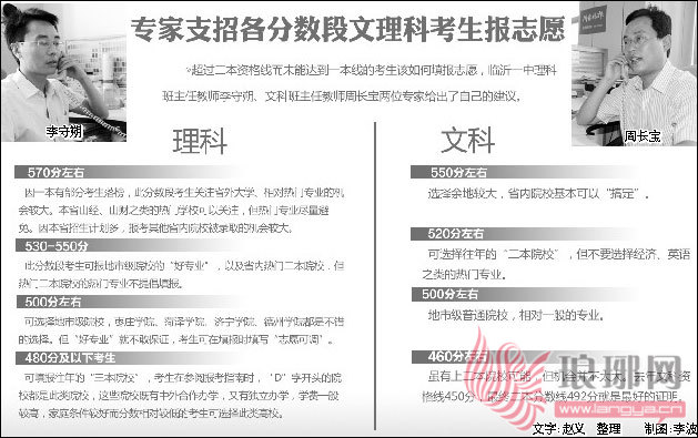 18日下午不到2点,便有不少考生和家长拨打晚报开通的高考咨询热线临沂大学专线,临沂大学招生办主任孙令民刚一坐下就开始接听电话。在3个小时的咨询时间里,记者发现500分左右的考生占了多数,他们的目标都是临沂大学。苍山的孙先生咨询道:“我的亲戚对高考填报志愿不太懂,委托我打电话咨询,两个孩子都是学理的,其中一个孩子考了499分,另外一个考了528分,不知道报考临沂大学有没有希望?”孙令民表示,由于去年临沂大学最低录取线偏高,文科达到了532分,理科达到523分,比二本的省属线均高出20分,造成很多考生今年不敢再报考临沂大学。他分析说,今年临沂大学的录取分数线肯定会较去年有所降低,所以528分的成绩很有希望,但499分的成绩有一定风险。