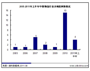 据清科研究中心数据显示,2005-2011年上半年中国物流行业并购案例数为29起,其中已经披露并购金额的案例数为20起,13起为跨国并购,4起并购企业具有 VC/PE 支持。从历年的并购情况来看,2010年的并购事件较多,已经披露的并购事件为15起,这一方面得益于物流行业的快递发展,大型物流公司在快速扩张过程中往往选取并购产业链上下游以“短平快”扩展自身的业务线,另一方面,2009年相关快递法规的出台,对于物流行业从业企业设定了更高的门槛,部分中小企业受制于资金,不得不选择被并购方式得以存续。