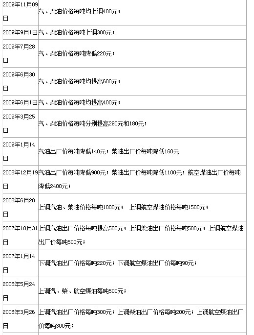 油价历次调整情况一览表: