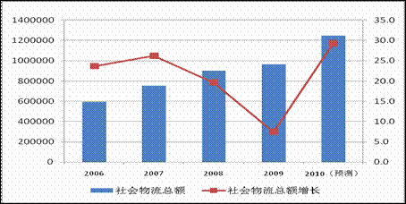 我国社会物流总额2010年预计为125万亿元,“十一五”时期将达到446万亿元,是“十五”时期的2.8倍,年均增长21%,扣除价格因素,可比增长15%左右。这一速度明显快于同期GDP的增长水平,反映了我国物流需求仍处在较高增长期。根据测算,2005年单位GDP对社会物流需求的系数为1:2.6,2009年为1:2.8,2010年预计达到1:3.2,表明目前我国每单位GDP产出需要3.2个单位的物流总额来支持,比2005年提高了23%,反映出物流需求对国民经济支撑作用进一步增强。