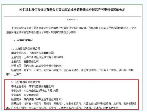 记者从中华人民共和国国家邮政局的网站获悉,包括苏宁电器股份有限公司在内的12家企业已经获得了快递业务经营许可。
