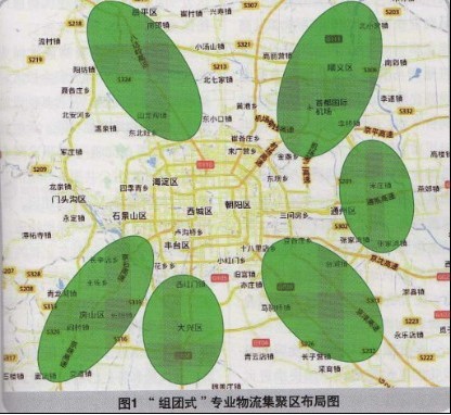 服务北京高端产业功能区、工业开发区以及专业集聚区的建设与发展,在五环和六环周边新建和改造相对集中、功能完善、规模化的物流中心或配送中心,引导物流资源集聚,形成多个“组团式”的专业物流设施空间布局。